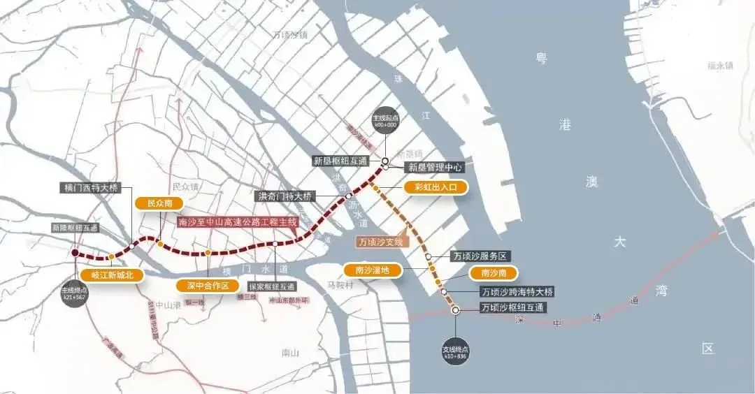据悉,深中通道南沙线,又名南中高速(万顷沙支线),是南中高速(主线)连接深中通道的重要道路,也是深中通道连接广州、南沙的重要“一线”。
