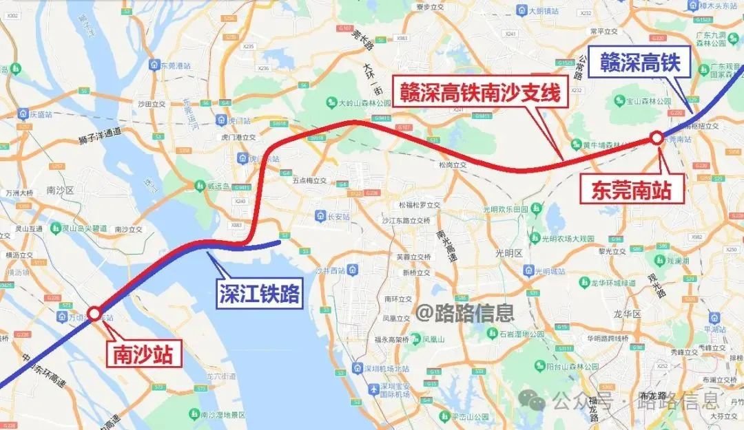 其中,中南虎城际调整为赣深高铁南沙支线,自赣深高铁东莞南站西侧预留接口引出,往西敷设,终于南沙站。